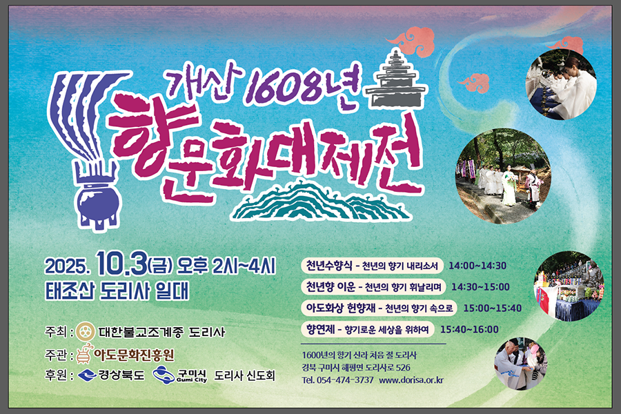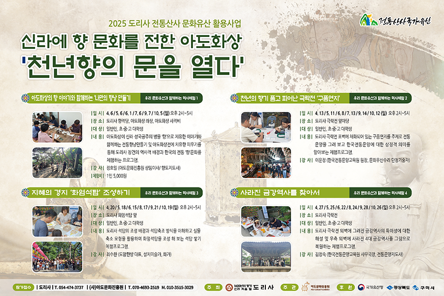 - 전통산사 문화유산 활용 사업 - 신라에 향문화를 전한 아도화상 ‘천년향의 문을 열다’ : 도리사의 찬란한 문화유산을 활용한 역사체험프로그램을 통해 문화유산의 소중한 가치를 공감하고 선조들과 미래세대들과 소통